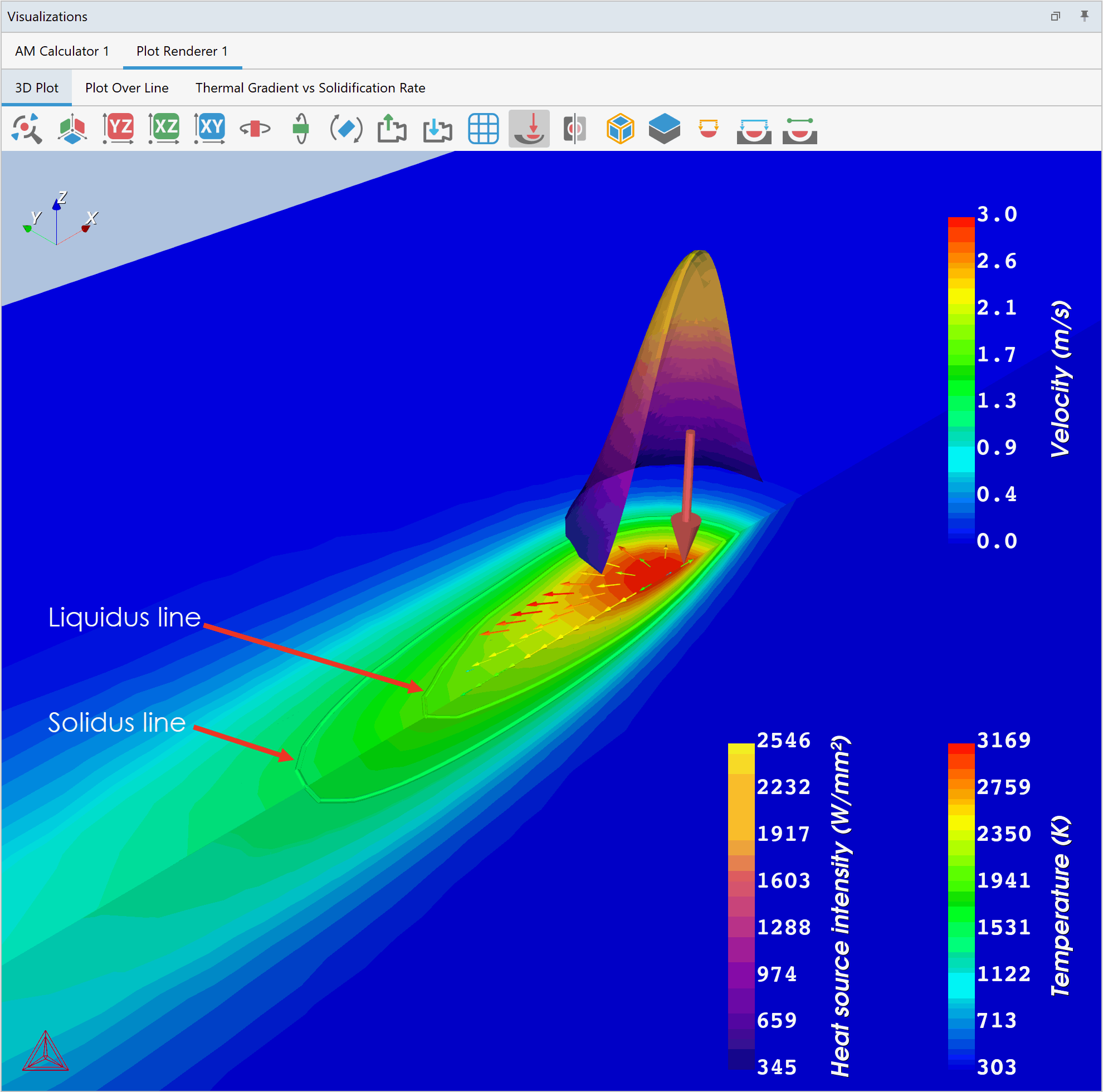 The heat source is represented by the canonical shape around the arrow and is a heat map of the surface intensity. For the Gaussian heat source mode, which we are using, the shape remains the same regardless of the configuration of the heat source. However, for the Core-ring mode, the surface changes shape depending on the Heat Source settings you set in the AM Calculator, such as power, radius, and absorptivity.
